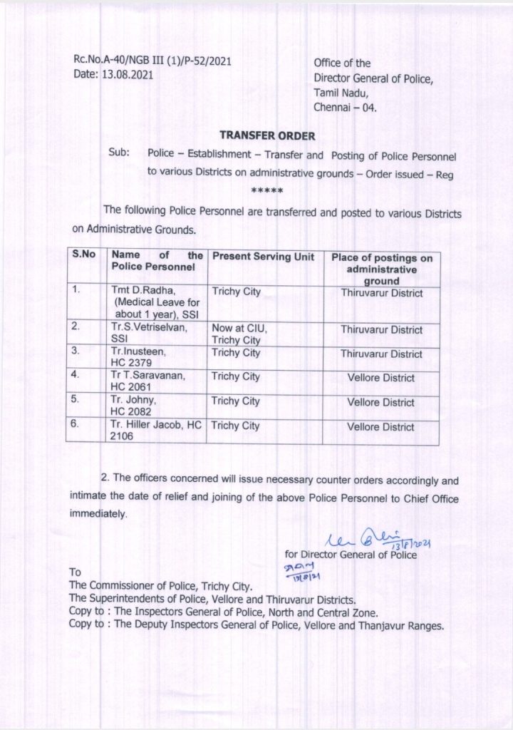 அதன்மூலம் நேற்று 13/8/2021 திருச்சி மாநகரில் பணியாற்றிய தனி படையை சேர்ந்த 4 போலீசார் அதிரடியாக மற்ற மாவட்டங்களுக்கு மாற்றப்பட்டுள்ளனர்