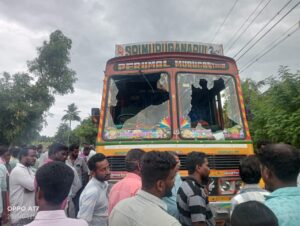 இதனால் ஆத்திரமடைந்த அப் பகுதி மக்கள் ஒன்று திரண்டு மணல் லாரியின் முன்பக்க கண்ணாடிகளை உடைத்துச் சேதப்படுத்தினர். மேலும், மணல் லாரிகள் அக் கிராமத்தின் வழியாகச் செல்வதைக் கண்டித்து சாலை மறியல் போராட்டத்தில் ஈடுபட்டனர்.