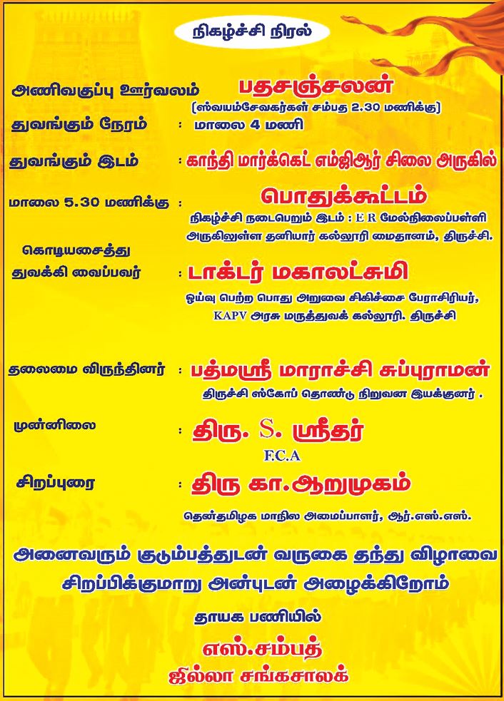 “ஸ்கோப்” தொண்டு நிறுவனத்தின் இயக்குநர் என்று அறியப்பட்ட பத்மஸ்ரீ மாராச்சி சுப்புராமன் எனது நீண்ட கால நெருங்கிய நண்பர். இன்று ஒரு அதிர்ச்சி. இவர் நேற்று திருச்சியில் நடைபெற்ற ஆர்.எஸ்.எஸ். பேரணி பொதுக்கூட்டத்திற்கு தலைமை வகித்ததாக செய்தி.