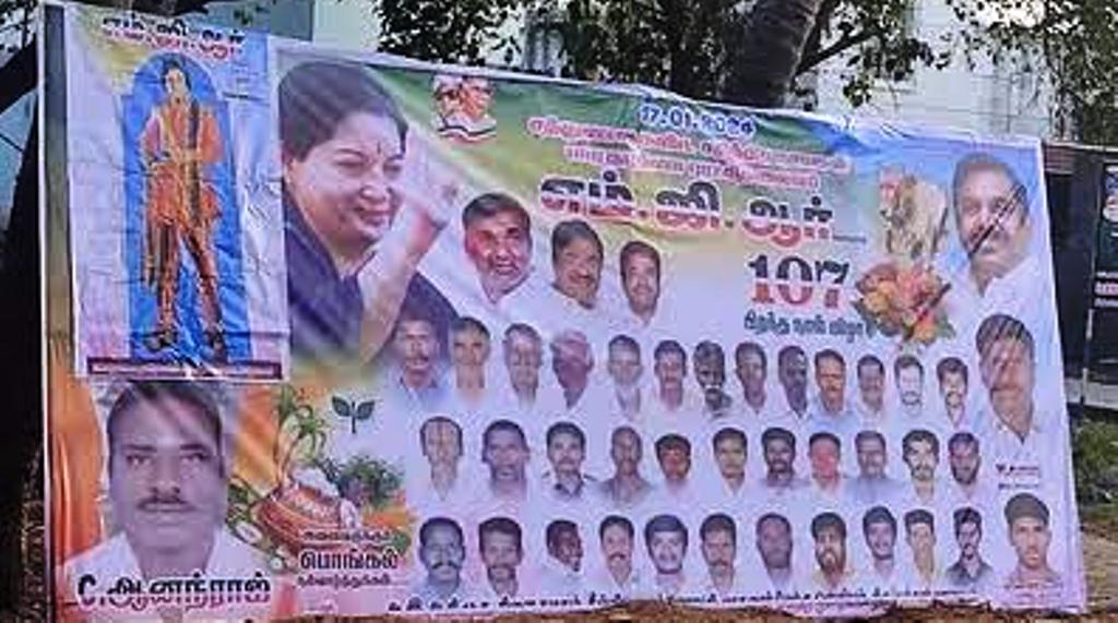 ஜனவரி-17, புரட்சித்தலைவர் எம்.ஜி.ஆர். பிறந்தநாளை முன்னிட்டு, திருப்பத்தூர் மாவட்டம் ஆம்பூர் அருகேயுள்ள கீழ்மிட்டாளம் பகுதி அதிமுகவினர் சார்பில் பிளக்ஸ் பேனர் வைத்துள்ளனர். அதில் எம்.ஜி.ஆருக்குப் பதிலாக, நடிகர் அரவிந்த்சாமியின் படம் இடம்பெற்றிருந்ததுதான் பலரையும் திரும்பிப் பார்க்க வைத்துவிட்டது.