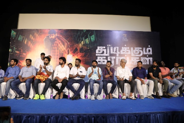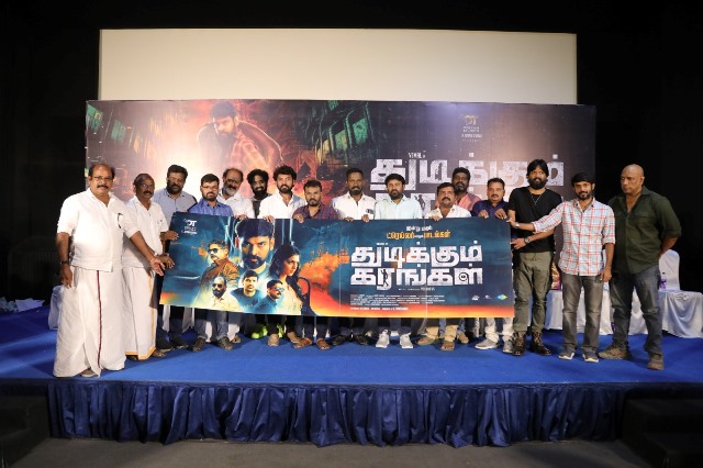 இந்த படம் வரும் செப்டம்பர் 1ஆம் தேதி வெளியாக உள்ளது. இதைத் தொடர்ந்து துடிக்கும் கரங்கள் படத்தின் இசை வெளியீட்டு விழா நேற்று (ஆக-23) மாலை சென்னை சாலிகிராமம் பிரசாத் லேபில் நடைபெற்றது. இந்த நிகழ்வில் படக்குழுவினருடன் சிறப்பு விருந்தினர்களாக தயாரிப்பாளர் கே.ராஜன், இயக்குனர்கள் பேரரசு, வசந்தமணி, திருமலை நடிகர்கள் ரோபோ சங்கர், காளிவெங்கட் , டேனி போப் உள்ளிட்ட பலர் கலந்து கொண்டனர்.