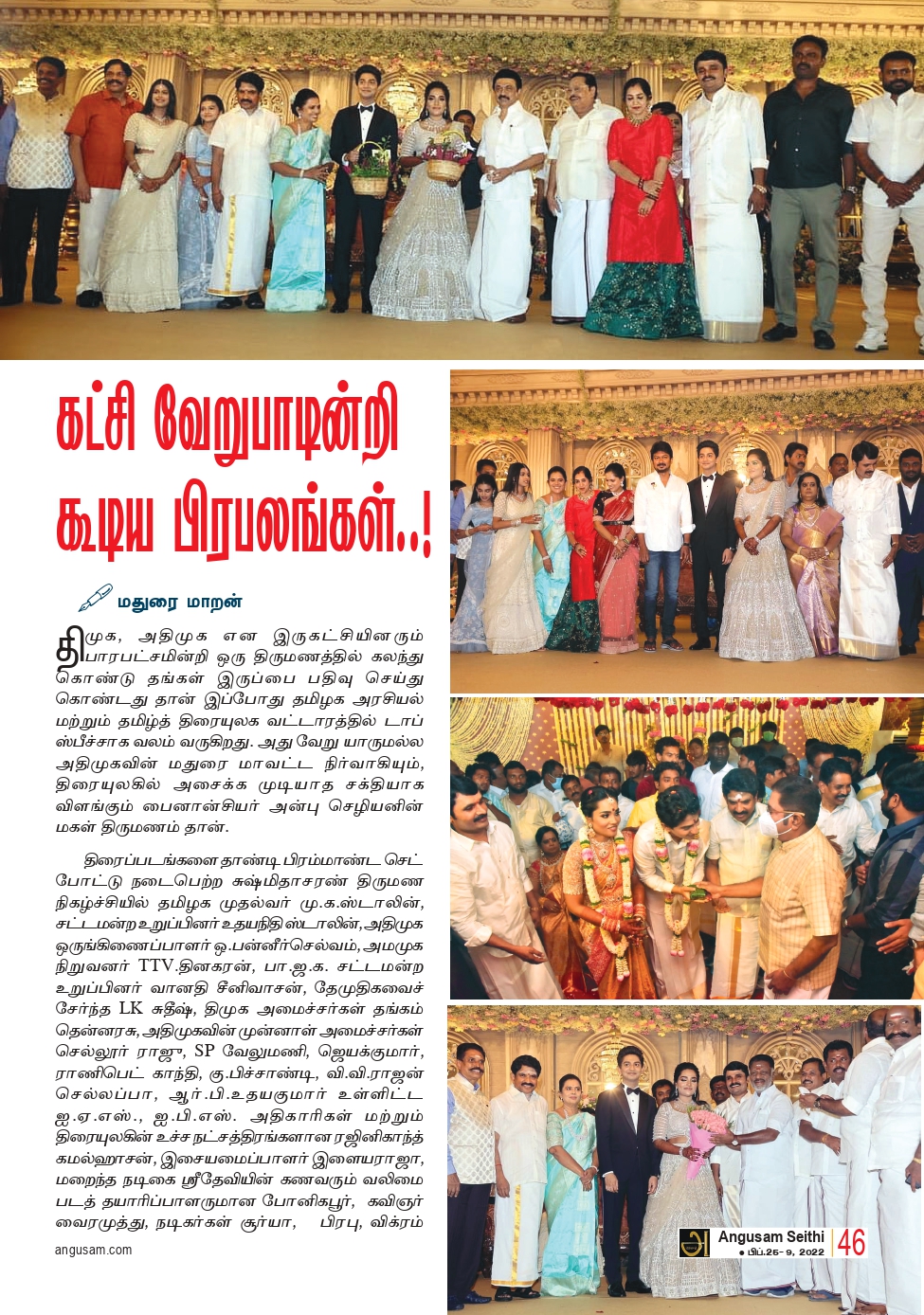 திமுக, அதிமுக என இருகட்சியினரும் பாரபட்சமின்றி ஒரு திருமணத்தில் கலந்து கொண்டு தங்கள் இருப்பை பதிவு செய்து கொண்டது தான் இப்போது தமிழக அரசியல் மற்றும் தமிழ்த் திரையுலக வட்டாரத்தில் டாப் ஸ்பீச்சாக வலம் வருகிறது. அது வேறு யாருமல்ல அதிமுகவின் மதுரை மாவட்ட நிர்வாகியும், திரையுலகில் அசைக்க முடியாத சக்தியாக விளங்கும் பைனான்சியர் அன்பு செழியனின் மகள் திருமணம் தான்.
