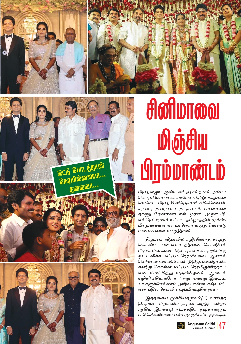 இத்தகைய முக்கியத்துவம்(!) வாய்ந்த திருமண விழாவில் நடிகர் அஜித், விஜய் ஆகிய இரண்டு நட்சத்திர நடிகர்களும் பங்கேற்கவில்லை என்பது குறிப்பிடத்தக்கது.