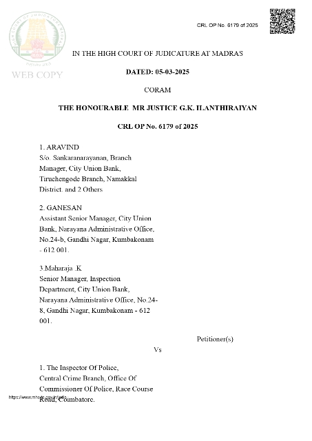 கடந்த மார்ச்-05 அன்று சென்னை உயர்நீதிமன்ற நீதியரசர் ஜி.கே.இளந்திரையன் முன்பாக விசாரணைக்கு வந்த வழக்கில், சிட்டி யூனியன் வங்கிக்கு எதிராக கோயம்புத்தூர் மத்திய குற்றப்பிரிவு போலீசில் பதியப்பபட்ட 74/2024 என்ற முதல் தகவல் அறிக்கை மீதான விசாரணைக்கு இடைக்கால தடை விதிக்கப்ட்டிருப்பதோடு, மேற்படி எஃப்.ஐ.ஆர்.ஐ ரத்து செய்ய வேண்டுமென்ற கோரிக்கையை விசாரணைக்கு ஏற்று எதிர்தரப்பிற்கு விளக்கம் கோரும் நோட்டீசை அனுப்பவும் உத்தரவிட்டிருக்கிறார், நீதியரசர் ஜி.கே.இளந்திரையன்.