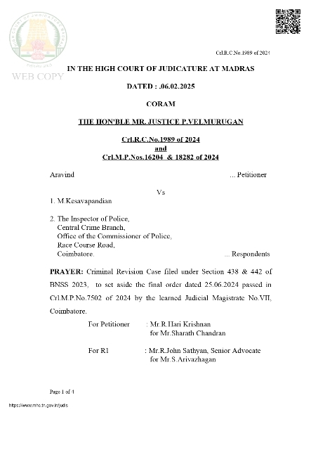 அதன்பிறகு, கோவை சிசிபி போலீசார் 13.09.2024 இல் என்னை நேரில் அழைத்து விசாரணை நடத்தினார்கள். சிட்டி யூனியன் வங்கி தரப்பிலும் விசாரணைக்கு அழைத்திருந்தார்கள். விசாரணையில் ஆஜராகி, உரிய ஆவணங்களை சமர்பிக்க 30 நாட்கள் அவகாசம் கேட்டு சென்றார்கள். இதற்கிடையில், சென்னை உயர்நீதிமன்றத்தில், கோவை குற்றவியல் நீதிமன்ற நீதிபதியின் உத்தரவுக்கு எதிராக கிரிமினல் ரிவிசன் பெட்டிசனை போட்டார்கள். அந்த வழக்கு நீதிமன்றத்தில் விசாரணைக்கு வருவதற்கு முன்பாகவே, கோவை சிசிபியில் 14.11.2024 இல் 74/2024 என்ற வழக்கை பதிவு செய்து எஃப்.ஐ.ஆர். போட்டுவிட்டார்கள். கோவை குற்றவியல் நீதிமன்ற உத்தரவின் அடிப்படையில் எஃப்.ஐ.ஆர். போட்ட பிறகு, அந்த உத்தரவில் ரிவிசன் கோர முடியாது. சட்டப்படி அதற்கு இடமில்லை.