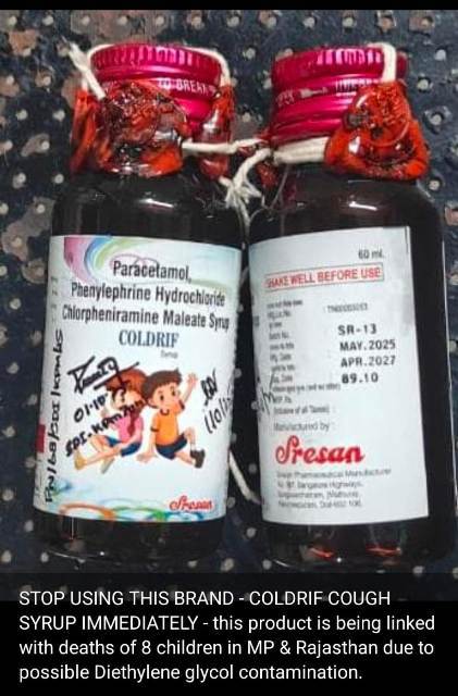 Coldrif எனும் ப்ராண்ட் இருமல் மருந்தைப் பருகிய மத்திய பிரதேசம் மற்றும் ராஜஸ்தான் மாநிலங்களைச் சார்ந்த எட்டு குழந்தைகள் இறந்திருக்கலாம் என்று சந்தேகிக்கப்படுவதால், உடனடியாக தற்போது சந்தையில் புலக்கத்தில் இருக்கும் COLDRIF சிரப்களின் விற்பனை முடக்கம் செய்ய மருந்துகள் கட்டுப்பாட்டு ஆணையம் ஆணை பிறப்பித்துள்ளது.