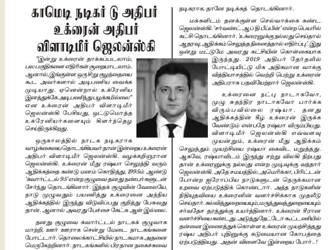 உக்ரைனை நட்பு நாடாகவோ, முழு சுதந்திர நாடாகவோ பார்க்க விரும்பவில்லை ரஷ்யா. தனது ஆதிக்கத்தின் கீழ் உக்ரைன் இருக்க வேண்டும் என்பதே ரஷ்யா விரும்பியது. விளாடிமீர் ஜெலன்ஸ்கி எவ்வளவு முயன்றும், உக்ரைன் மீது ஆதிக்கம் செலுத்தும் முயற்சியை ரஷ்யா கைவிட மறுத்தது. ஆகவே, ரஷ்யாவிடம் இருந்து சற்று விலகி நிற்பது தான் உக்ரைனுக்கு நல்லது என்ற முடிவுக்கு வந்தார் ஜெலன்ஸ்கி. அதே சமயத்தில், அமெரிக்கா, பிரிட்டன் போன்ற ஐரோப்பிய நாடுகளுடன் நெருக்கமான உறவை ஏற்படுத்திக் கொண்டார். அந்த நாடுகளின் நிதியுதவியை உக்ரைனின் வளர்ச்சிக்காக முதலீடு செய்தார். கல்வித்துறையையும், மருத்துவத்துறையையும் சர்வதேச தரத்துக்கு உயர்த்தினார். உக்ரைன் சீரான வளர்ச்சியை கண்டது. அடுத்து நேட்டோ கூட்டணியில் தன்னை இணைத்துக் கொள்ள உக்ரைன் முயற்சித்தது ரஷ்ய அதிபர் புதினுக்கு கடுமையான கோபத்தை ஏற்படுத்தியது. அதன் விளைவே இன்றைய போர்..!