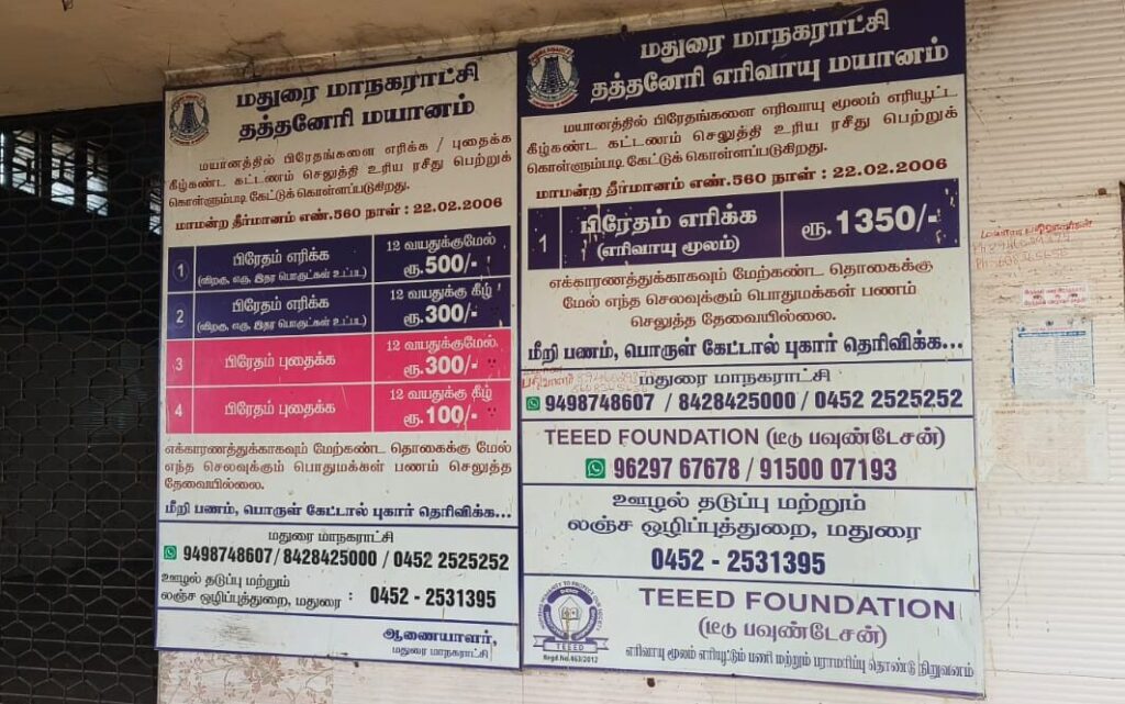 கட்டணமாக ரூ 1350- வசூலிக்கிறோம். அதலிருந்து மாநகராட்சிக்கு ரூ. 450-ஐ கட்டி விடுகிறோம். எஞ்சியிருக்கும் ரூ 950/-ஐ வைத்தே மற்ற செலவுகளை ஈடுகட்டி வருகிறோம். அடுத்தது எல்லோரும் இதனை மின் மயானம் என்கிறார்கள். அப்படியல்ல; இது எரிவாயு தகனமேடை” என்கிறார் தெளிவாக. மதுரை மாநகராட்சி மாமன்ற உறுப்பினர் மா.ஜெயராம் முன்வைத்திருக்கும் குற்றச்சாட்டுகள் குறித்து கள ஆய்வு செய்து உண்மை நிலையை மக்களுக்கு தெளிவுபடுத்துமா, மதுரை மாநகராட்சி நிர்வாகம்?