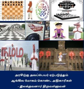 தமிழ்நாட்டின் புதிய திட்டங்கள் அல்லது முழக்கங்கள் முதலியவற்றில் ஆங்கிலப் பயன்பாடு இருப்பது வேதனையாக உள்ளது. ஒன்றிய அரசு இந்தியைத் திணிக்கிறது என்றால் தமிழக அரசு ஆங்கிலத்தைத் திணிக்கிறது. இந்தித் திணிப்பின் தீமைபோல் ஆங்கிலத்திணிப்பும் நமக்குத் தீமைதான். அதிகாரிகளின் ஆங்கில மோகம் ஆங்கிலத்திற்கு இடம் கொடுத்து அங்கு இருக்கும் அல்லது இருக்க வேண்டிய தமிழை அகற்றுகின்றனர். அதற்குச் சில சான்றுகளைக் கூறலாம். எனினும் இப்பொழுது நடைபெற உள்ள 44ஆவது சதுரங்க ஞாலப்போட்டி 2022 தொடர்பானவை குறித்துக் காணலாம்.