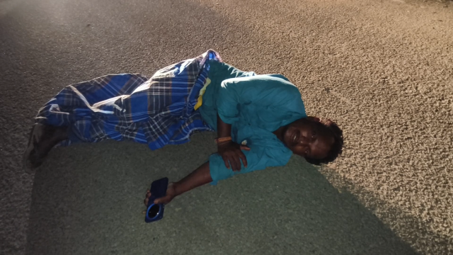 தூத்துக்குடி மாவட்டம் கோவில்பட்டி அருகேயுள்ள கொப்பம்பட்டி கிராமத்தைச் சேர்ந்தவர் வீரையன். இவர் நேற்று இரவு கோவில்பட்டிக்கு சென்று வீட்டு ஊருக்கு அரசு பஸ்சில் சென்றுள்ளார். மது போதையில் இருந்தவர் ஊருக்கு செல்லாமல் கரிசல்குளத்தில் இறங்கியது மட்டுமின்றி நடுரோட்டில் படுத்து கொண்டு மொபைலை பார்த்து கொண்டு இருந்துள்ளார்.