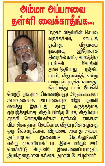 விஜய் பிறந்த போது விஜய்யை தூக்கி கொஞ்சியவர்கள் நாங்கள். நாங்கள் விமர்சிக்க தான் செய்வோம். விஜய் ரசிகர்களுக்கு ஒரு வேண்டுகோள். விஜய்யை அவரது அம்மா அப்பாவுடன் இணையச் சொல்லுங்கள்” என்று ‘முகமறியான்’ பட இசை மற்றும் டீசர் வெளியீட்டு விழாவில் இசையமைப்பாளரும், இயக்குனருமான கங்கை அமரன் பேசியுள்ளார்.