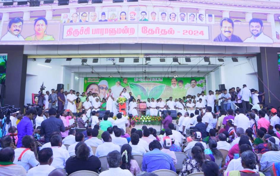 அதிமுக சார்பில் திருச்சி நாடாளுமன்றத் தொகுதியில் போட்டியிடும் வேட்பாளர் கருப்பையாவை ஆதரித்து அதிமுக பொதுச்செயலர் எடப்பாடி பழனிச்சாமி திருச்சியில் இன்று தனது அரசியல் பிரச்சாரத்தை மேற்கொண்டார்.