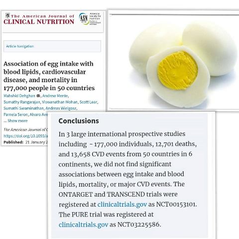 முட்டைகள் உண்பதற்கும் இதய நோய்க்கும் இதய நோயால் ஏற்படும் மரணங்களுக்கும் சம்பந்தம் இல்லை என்று ஐம்பது நாடுகளில் நடத்தப்பட்ட முக்கியமான மருத்துவ ஆய்வின் முடிவு வந்துள்ளது.