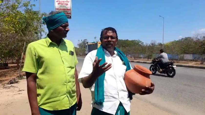 இயற்கை விவசாயி தங்கராசு என்பவர், தஞ்சாவூர் ஆட்சியர் அலுவலகத்தில் பானையுடன் வேட்பு மனுத் தாக்கல் செய்ய வந்துள்ளார். “குளிப்பது முதல் குடிப்பது வரை காவிரி தண்ணீர் தான், கர்நாடக அரசு காவிரியைத் தடுக்கிறது, இங்குள்ளவர்கள் யாரும் காவிரியை மதிக்கவில்லை. அதனால் காவிரிக்கு ஒரு ஆலயம் கட்ட வேண்டும், மாணவர்களுக்கு கல்வி கடன் வழங்க வேண்டும் மற்றும் இயற்கை வளங்களை பாதுகாக்க வலியுறுத்தியும் பானையில் பணத்தை சேகரித்து வேட்பு மனுத் தாக்கல்” செய்ய வந்ததாக கூறினார்.