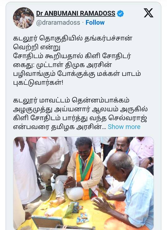 கடலூர் மாவட்டம் தென்னம்பாக்கம் அழகுமுத்து அய்யனார் ஆலயம் அருகில் கிளி சோதிடம் பார்த்து வந்த செல்வராஜ் என்பவரை தமிழக அரசின் வனத்துறை கைது செய்திருக்கிறது. கடலூர் தொகுதியில் போட்டியிடும் பாட்டாளி மக்கள் கட்சியின் வேட்பாளர் இயக்குனர் தங்கர்பச்சான் வெற்றி பெறுவார் என்று கிளிசோதிடம் பார்த்து கூறியதை தாங்கிக் கொள்ள முடியாமல் தான் இந்த பழிவாங்கும் நடவடிக்கையை திமுக அரசு மேற்கொண்டுள்ளது. பாசிசத்தின் உச்சமான இந்த நடவடிக்கை கண்டிக்கத்தக்கது என்றார் அன்புமணி ராமதாஸ்