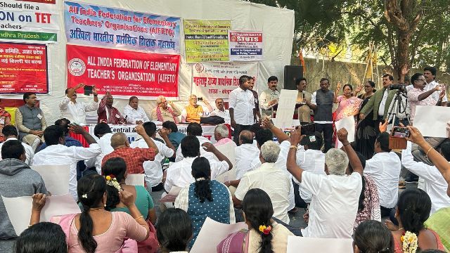 அரசு பள்ளி ஆசிரியர்களுக்கு TET தேர்வு கட்டாயம் என்பதை கைவிட வேண்டும். பழைய ஓய்வூதிய திட்டத்தை மீண்டும் அமல்படுத்த வேண்டும். கல்வி உரிமை சட்டத்தில் திருத்தம் கொண்டு வர வேண்டும் என்பது உள்ளிட்ட 14 அம்ச கோரிக்கைகளை வலியுறுத்தி ஐபெட்டோ (AIFETO) அகில இந்திய அமைப்பின் சார்பில், நவம்பர் 14ஆம் தேதி டெல்லி ஜந்தர் பந்தரில் ஒருநாள் அடையாள தர்ணா போராட்டத்தை நடத்தியுள்ளனர்.