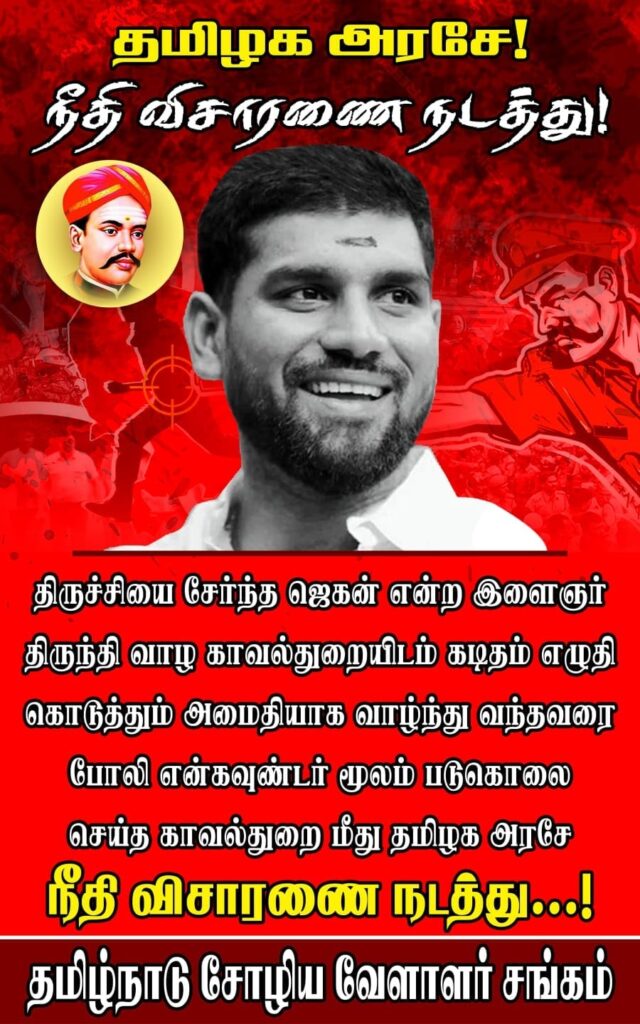 நீதிபதியின் விசாரணை மற்றும் பிரேத பரிசோதனை நடை முறைக்காக ஜெகனின் உடல் திருச்சி அரசு மருத்துவமனைக்கு கொண்டுவரப்பட்டது. அப்போது, அங்கே குழுமியிருந்த செய்தியாளர்களிடம், “அநியாயமாக என் மகனை கொன்னுட்டாங்களே”னு கதறி அழதபடியே பேட்டியளித்தார் ஜெகனின் தாயார்.