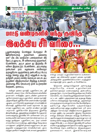ஒன்பது மாட்டு வண்டிகள். ஒவ்வொன்றிலும் ஒவ்வொரு படைப்பாளர்களின் படைப்புகள் பட்டுத் துணிகளில் சுற்றி. அந்தந்த மாட்டு வண்டிகளில் அதனதன் படைப்பாளர்களின் திருவுருவங்கள் ஓவியங்களாக வரையப்பட்ட வண்ணப் பதாகைககள். முத்தமிழையும் வெளிப்படுத்தும் விதமாக இயல் துறைக்கு புத்தகங்கள். இசைக்கு தாரை தப்பட்டைகள் முழங்க உறுமி மேள இசை. நாடகத்துக்கு மாட்டு வண்டிகளின் ஊர்வலத்துக்கு முன்பஇலக்கிய சீர் வரிசை மாட்டு வண்டிகள் ஊர்வலத்துக்கு முன்பாக, முக்கனிகளின் சீர் வரிசையும். ஒன்பது பெண்கள். ஒன்பது தாம்பாளங்கள். அவை களில் முக்கனிகள். இதற்கு முன்பாக தாரை தப்பட்டை உறுமி மேள இசையுடன் ஆடல் பாடல்கள். புதுக்கோட்டை பாரத் நகர் தங்கம் மூர்த்தி வீட்டு வாசலில் இருந்து தொடங்கியது, மாட்டு வண்டிகளில் இலக்கிய சீர் வரிசை ஊர்வலம். ராம் நகர் வழியாக திருமண மண்டபத் தை வந்தடைந்தது.
