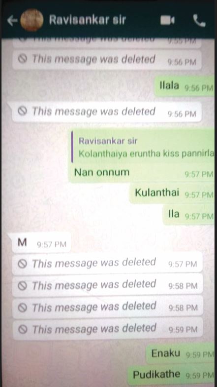 தன்னிடம் பயிலும் மாணவிகள் சிலரிடம் சாப்பிட்டியா தூங்கிட்டியா என்ன பன்றனு ஆரம்பிச்சு பாலியல் கேள்விகளோடு தொடரும் வாட்சப் சாட் உரையாடல் குறித்தும்; துறை அலுவலகத்தில்