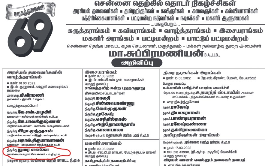 மார்ச்சு 1ஆம் நாள் தமிழ்நாடு முதல் அமைச்சர் மு.க.ஸ்டாலின் பிறந்தநாள் நிகழ்ச்சி வேளச்சேரியில் உள்ள குருநானக் கல்லூரியில் நடைபெற்றது. அதில் அனைத்துக் கட்சித் தலைவர்களும் வாழ்த்திப் பேசுவார்கள் என்று விழாவிற்கு 10 நாள்களுக்கு முன்பு கொடுக்கப்பட்ட அழைப்பிதழில் வாழ்த்திப் பேசும் தலைவர்களில் கடைசியில் துரை வைகோவின் பெயர் மதிமுக தலைமைக் கழகச் செயலாளர் என்று குறிப்பிடப்பட்டிருந்தது.