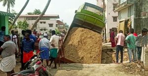 மணல் லாரி விபத்துக்குள்ளானதில் அதிர்ஷ்டவசமாக டிரைவர் உள்ளிட்ட யாருக்கும் எந்தவித பாதிப்பும் ஏற்படவில்லை. இச்சம்பவத்திற்கு காரணமானவர்கள் மீது உரிய விசாரணை மேற்கொண்டு நடவடிக்கை எடுக்க வேண்டும் என்கின்றனர் அப்பகுதி மக்கள்.