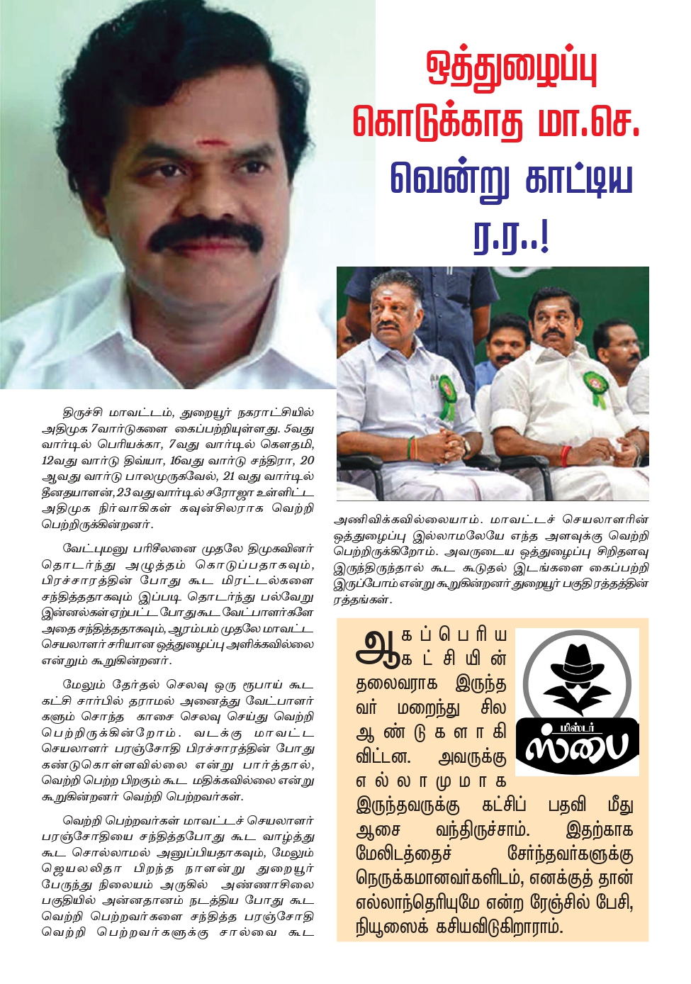 வெற்றி பெற்றவர்கள் மாவட்டச் செயலாளர் பரஞ்சோதியை சந்தித்தபோது கூட வாழ்த்து கூட சொல்லாமல் அனுப்பியதாகவும், மேலும் ஜெயலலிதா பிறந்த நாளன்று துறையூர் பேருந்து நிலையம் அருகில் அண்ணாசிலை பகுதியில் அன்னதானம் நடத்திய போது கூட வெற்றி பெற்றவர்களை சந்தித்த பரஞ்சோதி வெற்றி பெற்றவர்களுக்கு சால்வை கூட அணிவிக்கவில்லையாம். மாவட்டச் செயலாளரின் ஒத்துழைப்பு இல்லாமலேயே எந்த அளவுக்கு வெற்றி பெற்றிருக்கிறோம். அவருடைய ஒத்துழைப்பு சிறிதளவு இருந்திருந்தால் கூட கூடுதல் இடங்களை கைப்பற்றி இருப்போம் என்று கூறுகின்றனர் துறையூர் பகுதி ரத்தத்தின் ரத்தங்கள்.
