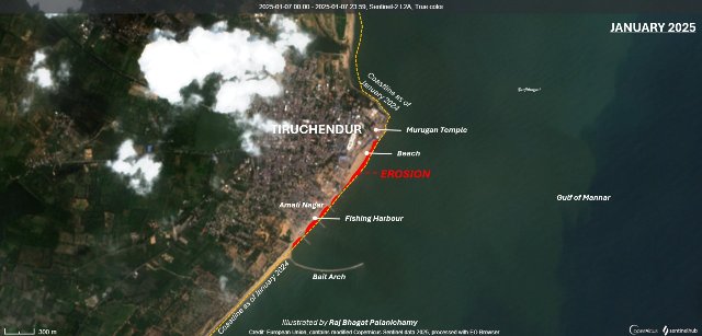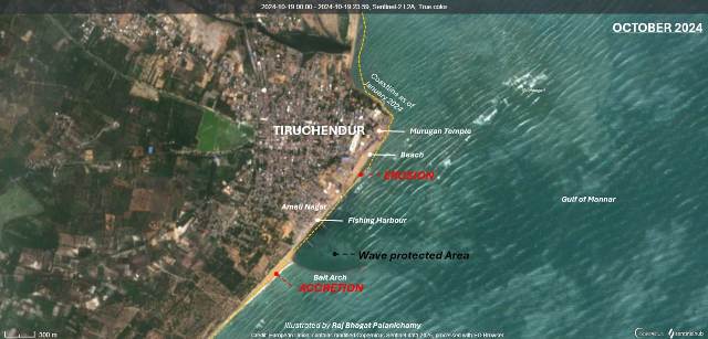 இனியும் கடல் அரிப்பால் திருச்செந்தூர் கடற்கரையை காக்க கடற்கரை மேலாண்மை சட்டங்களை பின்பற்றாமல் , தேசிய பசுமை தீர்ப்பாயத்தின் ஆணையை பின்பற்றாமல் கடினமான கட்டுமானங்களை நம் பகுதி கடலுக்குள் மேற்கொண்டால் வீரபாண்டியன் பட்டினம் கடற்கரையோ , காயல்பட்டினம் கடற்கரையோ கொம்பு துறையோ , சிங்கி துறையோ , புன்ன காயல் கடற்கரையோ அடுத்த கடல் அரிப்பால் பாதிக்கப்படும் என்பது தான் உண்மை.