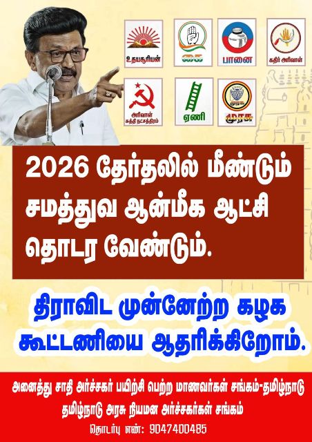 ஆரியத்திற்கு எதிராக, சனாதன மனுதர்மத்திற்கு எதிரான தொடர் போராட்டத்தை முன்னெடுக்க வேண்டும் அதில் தமிழகத்தில் உள்ள பெரிய கோயில் ஆகம கோவில்களில் திருவண்ணாமலை அருள்மிகு அருணாச்சலேஸ்வரர் திருக்கோயில், மதுரை மீனாட்சி அம்மன் கோயில் ஸ்ரீரங்கம் ரங்கநாதர் திருக்கோயில் சென்னை பார்த்தசாரதி திருக்கோயில் போன்ற கோயில்களில் மாணவர்களை அர்ச்சகர் பணிக்கு கருவறையில் சமத்துவமாக அர்ச்சகராகவும் ஓதுவராகவும் பணியாற்ற தொடர் போராட்டத்தை திமுக முன்னெடுக்க வேண்டும் என்று அர்ச்சகர் பயிற்சி பெற்ற மாணவர் சங்கம் சார்பாக உங்களிடம் கோரிக்கை முன்வைக்கிறோம்.