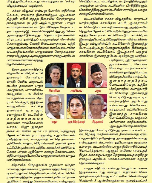 ஸ்டாலினின் சக்கர வியூகத்தில், கர்நாடக மாநிலத்தில் காங்கிரஸ் கட்சி, குமாரசாமி கட்சியோடு உடன்பாடு கொள்வது, ஆந்திராவில் தெலுங்கு தேசக் கட்சியோடும், தெலுங்கானாவில் சந்திரசேகர்ராவ் கட்சியோடும் காங்கிரஸ் இணைந்து போட்டியிடுவது, கேரளாவில் காங்கிரஸ் இடது கம்யூனிஸ்ட்டு கட்சியோடு இணைந்து போட்டியிடுவது, மேற்குவங்கத்தில் திரிணமூல் காங்கிரஸ் கட்சியோடு இடதுசாரி மற்றும் காங்கிரஸ் இணைந்து போட்டியிடுவது, மத்தியப் பிரதேசம், இராஜஸ்தான், ஜார்க்கண்ட், கோவா போன்ற மாநிலங்களில் காங்கிரஸ் தனித்து போட்டியிடுவது, பீகாரில் ராஷ்ட்ரிய ஜனதாதளத்தோடு போட்டியிடுவது. உத்திர பிரதேசத்தில் சமாஜ்வாதி கட்சியோடு இணைந்து போட்டியிடு வது. மராட்டிய மாநிலத்தில் தற்போது உள்ளவாறு சிவசேனா, சரத்பவார் கட்சிகளோடு இணைந்து காங்கிரஸ் போட்டியிடுவது, பஞ்சாப், அரியானா மாநிலங்களில் ஆம்ஆத்மியோடு காங்கிரஸ் இணைந்து போட்டியிடுவது, அசாம் உள்ளிட்ட வடகிழக்கு மாநிலங்களில் நிலைமைக்கு ஏற்ப பாஜக எதிர்ப்பு வியூகத்தை அமைத்துக் கொள்வது என்பதுதான் ஸ்டாலின் தற்போதைய முடிவாக உள்ளது. ஸ்டாலினின் பாஜக தீவிர எதிர்ப்பைத் தொடர்ந்துதான் ஆளுநர் ரவியை வைத்துத் திமுக அரசுக்குப் பாஜக நெருக்கடியைத் தருகிறது என்றும் அரசியல் பார்வையாளர்கள் கருத்து தெரிவிக்கின்றனர்.