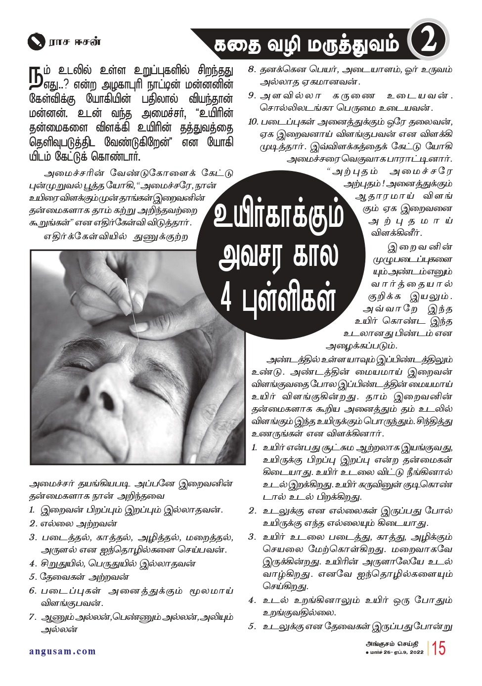 நம் உடலில் உள்ள உறுப்புகளில் சிறந்தது எது..? என்ற அழகாபுரி நாட்டின் மன்னனின் கேள்விக்கு யோகியின் பதிலால் வியந்தான் மன்னன். உடன் வந்த அமைச்சர், “உயிரின் தன்மைகளை விளக்கி உயிரின் தத்துவத்தை தெளிவுபடுத்திட வேண்டுகிறேன்” என யோகியிடம் கேட்டுக் கொண்டார்.