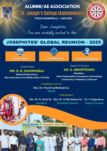திருச்சி செயின்ட் ஜோசப் கல்லூரியில் பிப்ரவரி 01 ஆம் தேதி மாலை 4.30 மணிக்கு முன்னாள் மாணவர்களின் உலகளாவியக் கூடுகை நடைபெற உள்ளது.