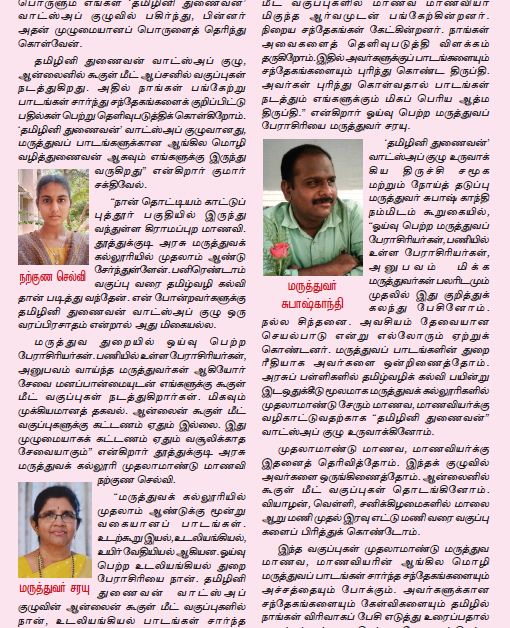 தமிழினி துணைவன் வாட்ஸ்அப் குழு, ஆன்லைனில் கூகுள் மீட் ஆப்சனில் வகுப்புகள் நடத்துகிறது. அதில் நாங்கள் பங்கேற்று பாடங்கள் சார்ந்து சந்தேகங்களைக் குறிப்பிட்டு பதில்கள் பெற்று தெளிவுபடுத்திக் கொள்கிறோம். ‘தமிழினி துணைவன்’ வாட்ஸ்அப் குழுவானது, மருத்துவப் பாடங்களுக்கான ஆங்கில மொழி வழித்துணைவன் ஆகவும் எங்களுக்கு இருந்து வருகிறது” என்கிறார் குமார் சக்திவேல்.