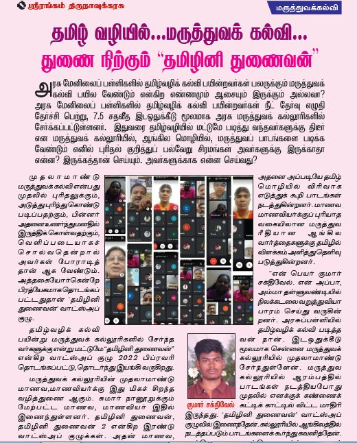 “என் பெயர் குமார் சக்திவேல். என் அப்பா, அம்மா தள்ளுவண்டியில் நிலக்கடலை வறுத்து வியா பாரம் செய்து வருகின் றனர். அரசுப்பள்ளியில் தமிழ்வழிக் கல்வி படித்த வன் நான். இடஒதுக்கீடு மூலமாக சென்னை மருத்துவக் கல்லூரியில் முதலாமாண்டு சேர்ந்துள்ளேன். மருத்துவ கல்லூரியில் ஆரம்பத்தில் பாடங்கள் நடத்தியபோது முதலில் எனக்குக் கண்ணைக் கட்டிக் காட்டில் விட்ட மாதிரி இருந்தது. ‘தமிழினி துணைவன்’ வாட்ஸ்அப் குழுவில் இணைந்தேன். கல்லூரியில் ஆங்கிலத்தில் நடத்தப்படும் பாடங்களைக் கூர்ந்து கவனித்தேன். முக்கியமான ஆங்கில வார்த்தைகளைக் குறித்து வைத்துக் கொள்வேன். அந்த ஆங்கில வார்த்தைகளுக்கான தமிழும் அதன் விரிவான பொருளும் எங்கள் ‘தமிழினி துணைவன்’ வாட்ஸ்அப் குழுவில் பகிர்ந்து, பின்னர் அதன் முழுமையானப் பொருளைத் தெரிந்து கொள்வேன்.