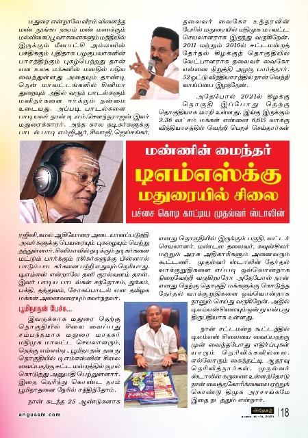 அதே போல 2023 ஏப்ரல் 1-5ம் தேதி இதழில் மதுரையை கலக்கிய டிஎம்எஸ்-ன் 100வது பிறந்தநாள் இன்னிசை நிகழ்ச்சி என்ற தலைப்பில் செய்தி, படங்களுடன் வெளியிட்டு அங்குசம் இதழ் சிறப்பு சேர்த்தது. இந்நிகழ்ச்சியை சுப்பிரமணியன் நடத்தினார். இதில் அமெரிக்காவிலிருந்து பாடகர் ஒருவர் வந்து பாட்டுப் பாடி அசத்தினார்.