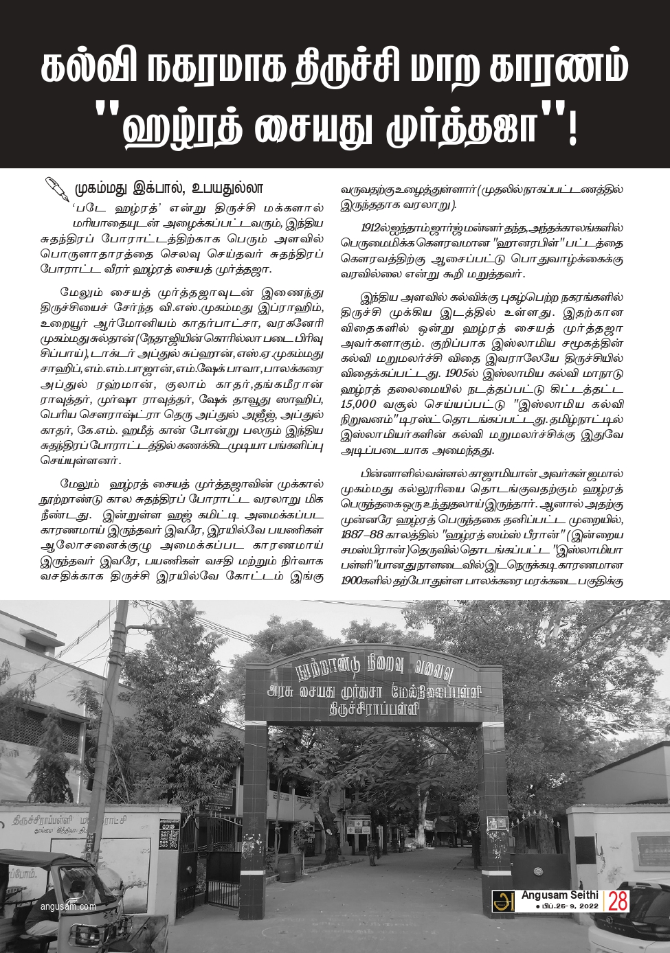 ‘படே ஹழ்ரத்’ என்று திருச்சி மக்களால் மரியாதையுடன் அழைக்கப்பட்டவரும், இந்திய சுதந்திரப் போராட்டத்திற்காக பெரும் அளவில் பொருளாதாரத்தை செலவு செய்தவர் சுதந்திரப் போராட்ட வீரர் ஹழ்ரத் சையத் முர்த்தஜா.