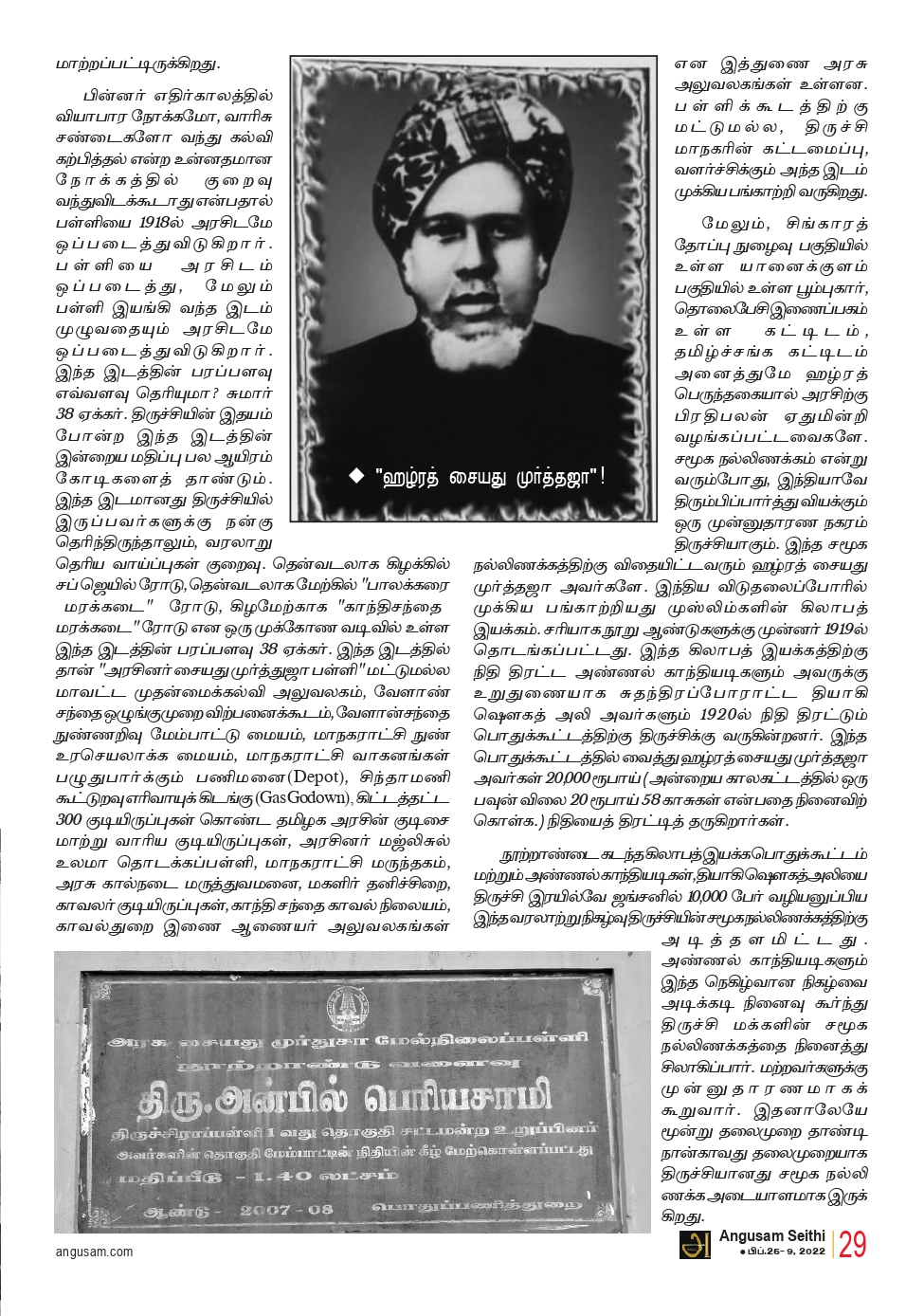 மேலும், சிங்காரத் தோப்பு நுழைவு பகுதியில் உள்ள யானைக்குளம் பகுதியில் உள்ள பூம்புகார், தொலைபேசி இணைப்பகம் உள்ள கட்டிடம், தமிழ்ச்சங்க கட்டிடம் அனைத்துமே ஹழ்ரத் பெருந்தகையால் அரசிற்கு பிரதிபலன் ஏதுமின்றி வழங்கப்பட்டவைகளே. சமூக நல்லிணக்கம் என்று வரும்போது, இந்தியாவே திரும்பிப்பார்த்து வியக்கும் ஒரு முன்னுதாரண நகரம் திருச்சியாகும். இந்த சமூக நல்லிணக்கத்திற்கு விதையிட்டவரும் ஹழ்ரத் சையது முர்த்தஜா அவர்களே. இந்திய விடுதலைப்போரில் முக்கிய பங்காற்றியது முஸ்லிம்களின் கிலாபத் இயக்கம். சரியாக நூறு ஆண்டுகளுக்கு முன்னர் 1919ல் தொடங்கப்பட்டது. இந்த கிலாபத் இயக்கத்திற்கு நிதி திரட்ட அண்ணல் காந்தியடிகளும் அவருக்கு உறுதுணையாக சுதந்திரப்போராட்ட தியாகி ஷௌகத் அலி அவர்களும் 1920ல் நிதி திரட்டும் பொதுக்கூட்டத்திற்கு திருச்சிக்கு வருகின்றனர். இந்த பொதுக்கூட்டத்தில் வைத்து ஹழ்ரத் சையது முர்த்தஜா அவர்கள் 20,000 ரூபாய் (அன்றைய காலகட்டத்தில் ஒரு பவுன் விலை 20 ரூபாய் 58 காசுகள் என்பதை நினைவிற் கொள்க.) நிதியைத் திரட்டித் தருகிறார்கள்.
