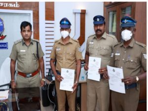 பெரும் குற்றம் நடைபெறாமல் தடுக்கும் வகையிலும், காவல்துறைக்கு புகழ் சேர்க்கும் வகையிலும் செயல்பட்ட மேற்படி மூன்று காவலர்களையும் தஞ்சாவூர் சரக போலீஸ் டிஐஜி பிரவேஷ் குமார் மீனா சான்றிதழ் வழங்கி, வெகுவாகப் பாராட்டினார்.