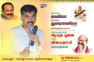 வைகோ மகன் வையாபுரியின் கருத்துகள் “பாஜக சிந்தனையோட்டத்தோடு உள்ளது” என்று அண்மையில் ஒரு முகநூல் பதிவில் குறிப்பிடப்பட்டிருந்தது. அதனை உறுதிப்படுத்தும் விதமாக அரியலூர் சட்டமன்ற மதிமுக (சட்டப்படி திமுக) உறுப்பினர் சின்னப்பா பெரியார், அண்ணா, வைகோ, துரை வைகோ படம் போட்டு ஆயுதப் பூஜை, சரஸ்வதி பூஜை வாழ்த்து தெரிவித்த பதாகை முகநூலில் வெளியிடப்பட்டது. அதற்கு மதிமுகவினர் பலரும் கடும் கண்டனம் தெரிவிக்கவே அந்தப் பதிவு சில நாள்களில் நீக்கம் செய்யப்பட்டது. துரை வையாபுரி என்னும் துரை வைகோவின் அரசியல் நுழைவு பெரும்பான்மை இந்துக்களைக் குறித்து நகரத் தொடங்கும் என்ற சிந்தனையோட்டம் தெளிவாகவே உள்ளது. மதிமுகவின் அடிநாதமாக இருந்த ஈழப்பிரச்சினை அமைதியாகிவிட்டது.