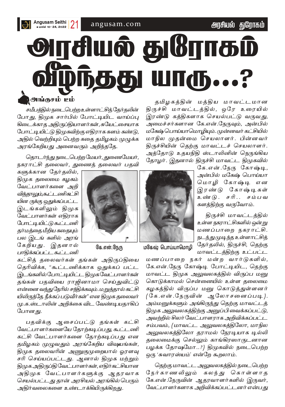 தமிழகத்தின் மத்திய மாவட்டமான திருச்சி மாவட்டத்தில், ஒரே உரையில் இரண்டு கத்திகளாக செயல்பட்டு வருவது, அமைச்சர்களான கே.என்.நேருவும், அன்பில் மகேஷ் பொய்யாமொழியும். முன்னவர் கட்சியில் மாநில முதன்மை செயலாளர். பின்னவர் திருச்சியின் தெற்கு மாவட்டச் செயலாளர். அத்தோடு உதயநிதி ஸ்டாலினின் நெருங்கிய தோழர். இதனால் திருச்சி மாவட்ட திமுகவில் கே.என்.நேரு கோஷ்டி, அன்பில் மகேஷ் பொய்யா மொழி கோஷ்டி என இரண்டு கோஷ்டிகள் உண்டு. சரி.. சம்பவ களத்திற்கு வருவோம்.