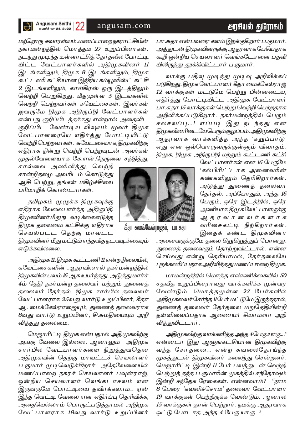 மெஜாரிட்டி திமுக என்பதால் அதிமுகவிற்கு அங்கு வேலை இல்லை. ஆனாலும்  அதிமுக சார்பில் வேட்பாளர்களை நிறுத்துவதென அதிமுகவின் தெற்கு மாவட்டச் செயலாளர் ப.குமார் முடிவெடுக்கிறார். அதேவேளையில் மணப்பாறை நகரச் செயலாளர் பவுன்ராஜ், ஒன்றிய செயலாளர் வெங்கடாசலம் என இருவருமே போட்டியை தவிர்க்கலாம்.. ஏன் இந்த வெட்டி வேலை என எதிர்ப்பு தெரிவிக்க, அதையெல்லாம் பொருட்படுத்தாமல் அதிமுக வேட்பாளராக 18வது வார்டு உறுப்பினர் பா.சுதா என்பவரை களம் இறக்குகிறார் ப.குமார். அத்துடன் திமுகவினருக்கு ஆதரவாக பேசியதாக கூறி ஒன்றிய செயலாளர் வெங்கடேசனை பதவியிலிருந்து தூக்கிவிட்டார் ப.குமார்.