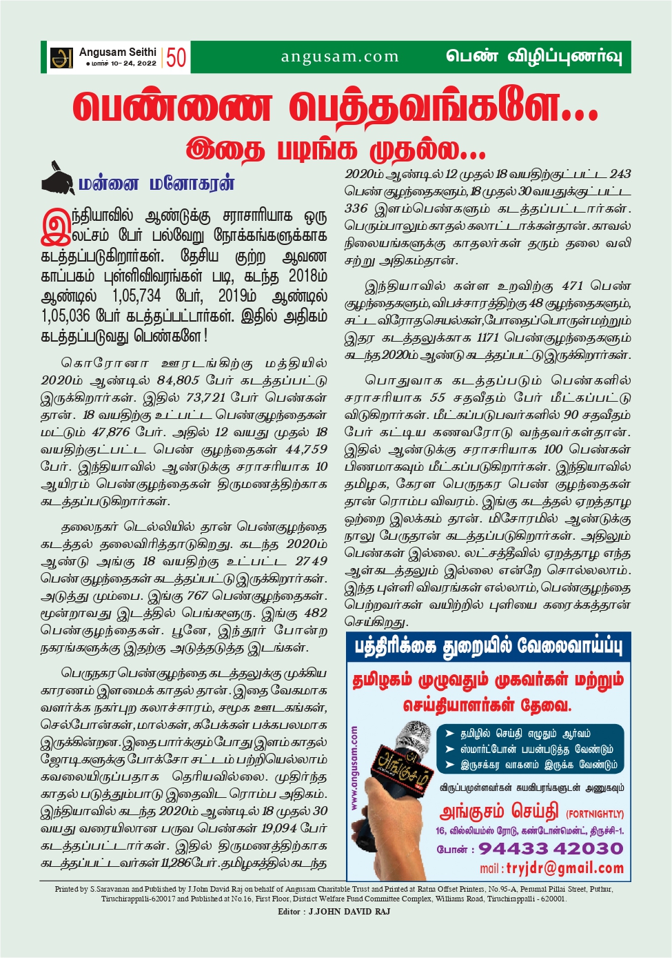 கொரோனா ஊரடங்கிற்கு மத்தியில் 2020ம் ஆண்டில் 84,805 பேர் கடத்தப்பட்டு இருக்கிறார்கள். இதில் 73,721 பேர் பெண்கள் தான். 18 வயதிற்கு உட்பட்ட பெண்குழந்தைகள் மட்டும் 47,876 பேர். அதில் 12 வயது முதல் 18 வயதிற்குட்பட்ட பெண் குழந்தைகள் 44,759 பேர். இந்தியாவில் ஆண்டுக்கு சராசரியாக 10 ஆயிரம் பெண்குழந்தைகள் திருமணத்திற்காக கடத்தப்படுகிறார்கள்.